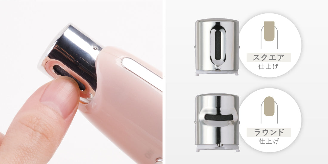 爪先ヤスリを本体に取り付け、形と長さを整えます。お好みの形(ラウンドまたはスクエア)が選べます。