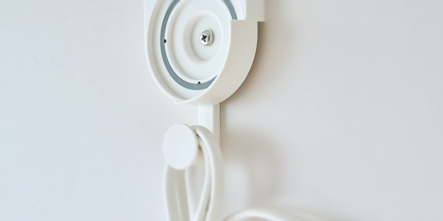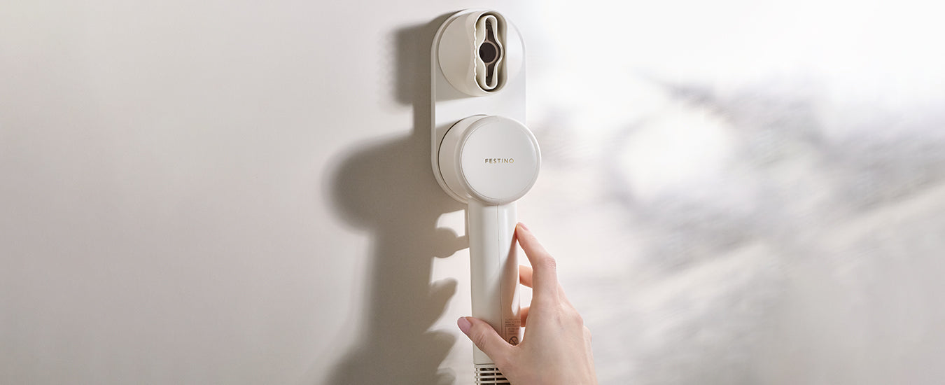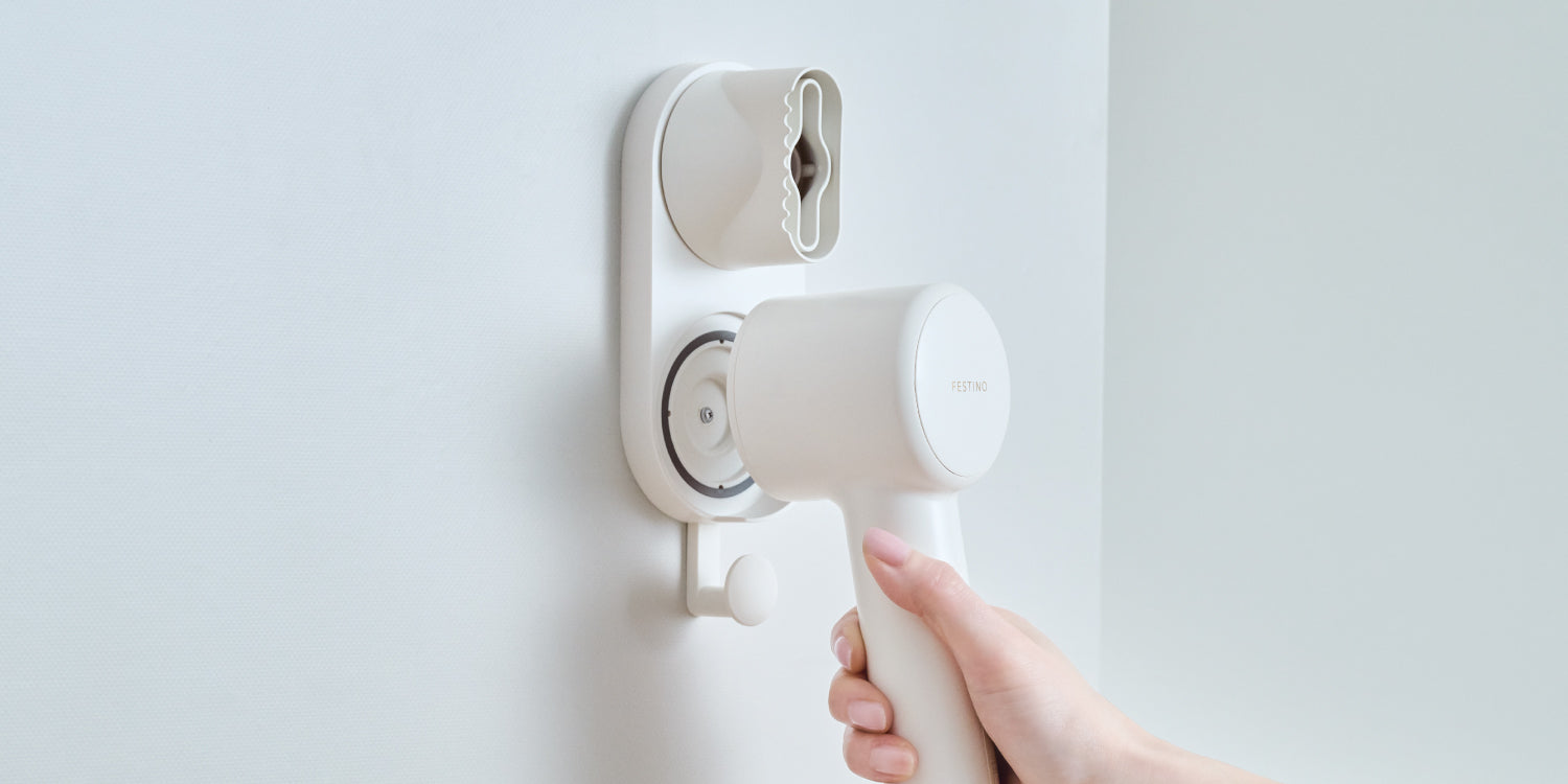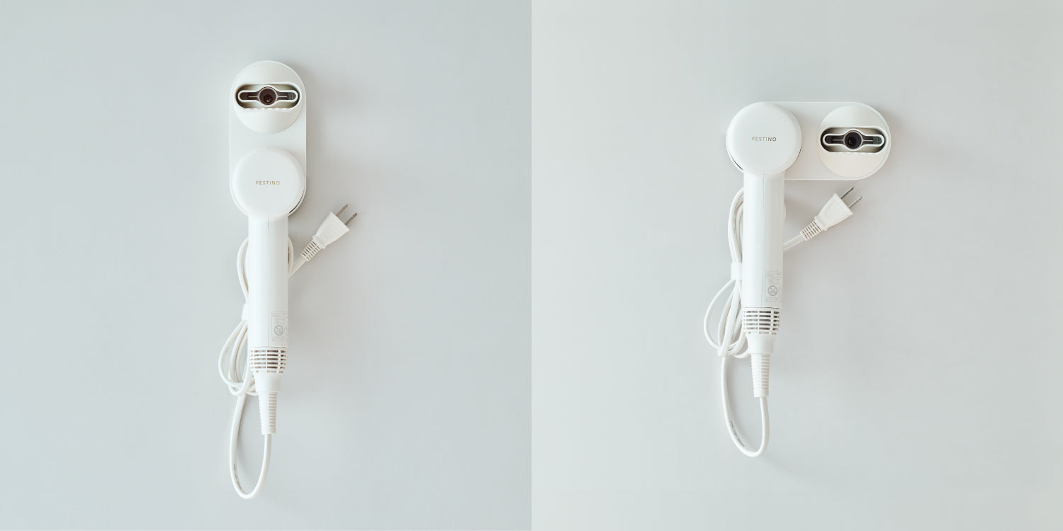 壁に取り付けるだけで、ドライヤー本体とノズル、コードをすっきり収納できます。
