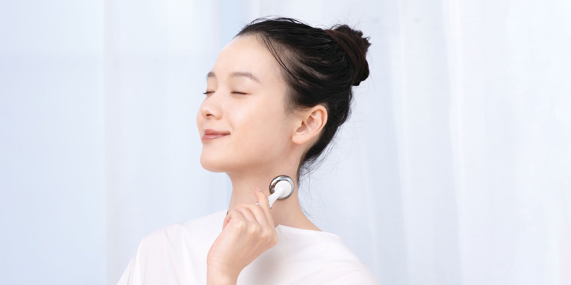 ヘッドを肌に軽く当ててやさしくゆっくり動かします。ヘッドの大きな面を使って肌表面を整えて、ヘリを使って細かい部分ケアができます。
