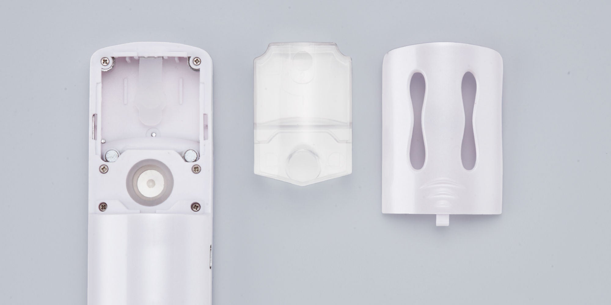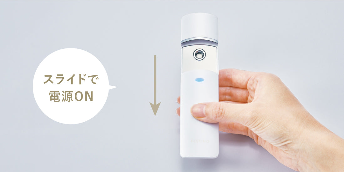 本体カバーを下にスライドすると、吹出口からミストが噴射します(連続噴射約50秒)。